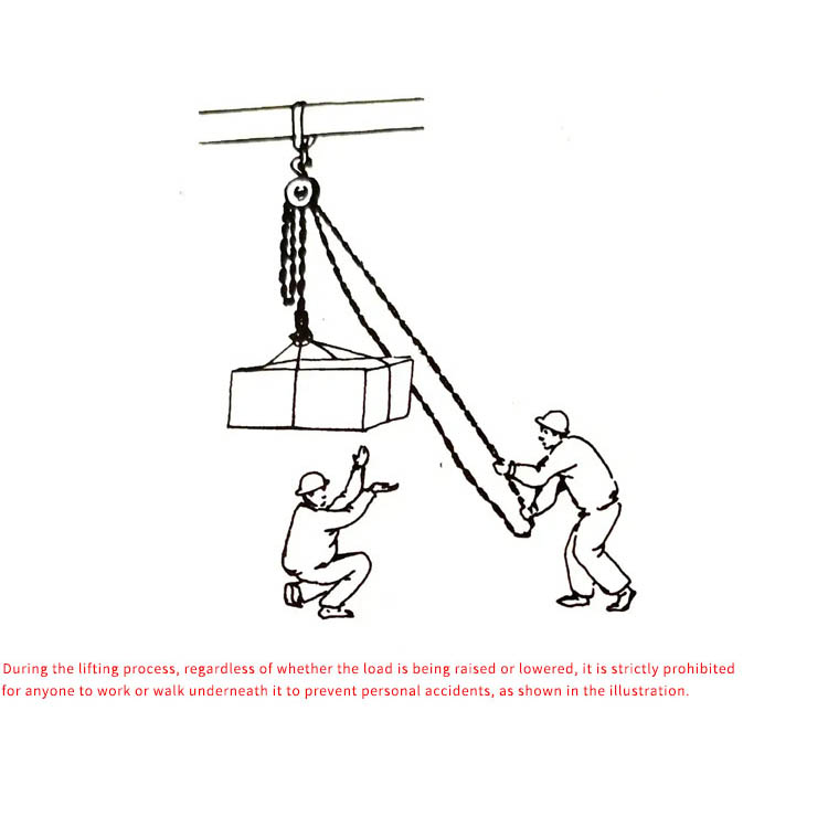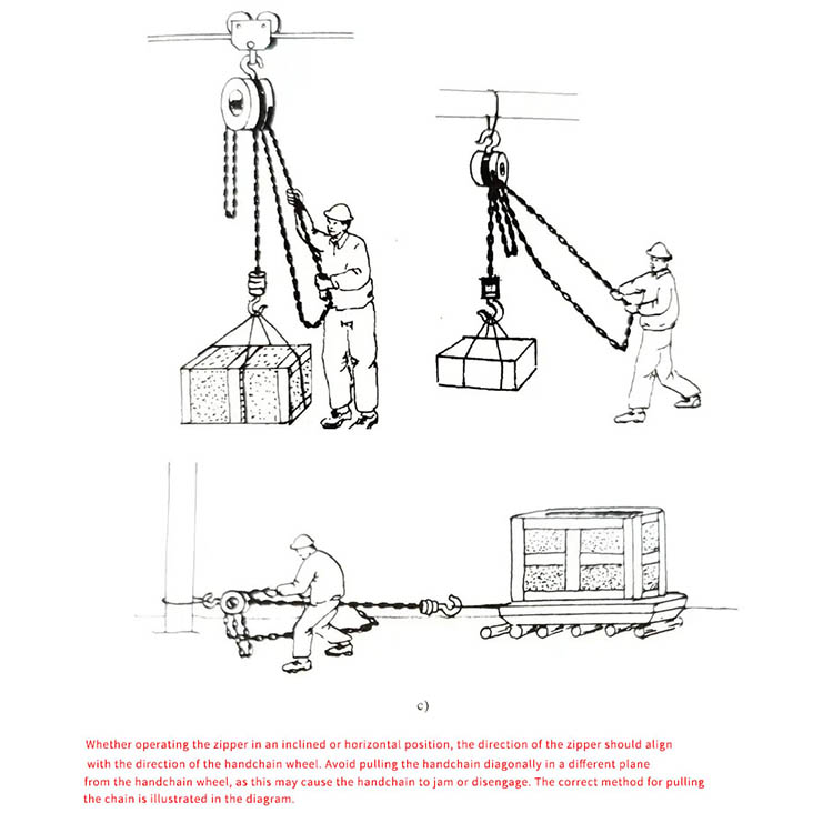 Oikea veto: Vedä käsiketjua tasaisesti ja pystysuunnassa ketjun suunnassa; älä vedä vinossa tai anna useiden ihmisten vetää väkisin.